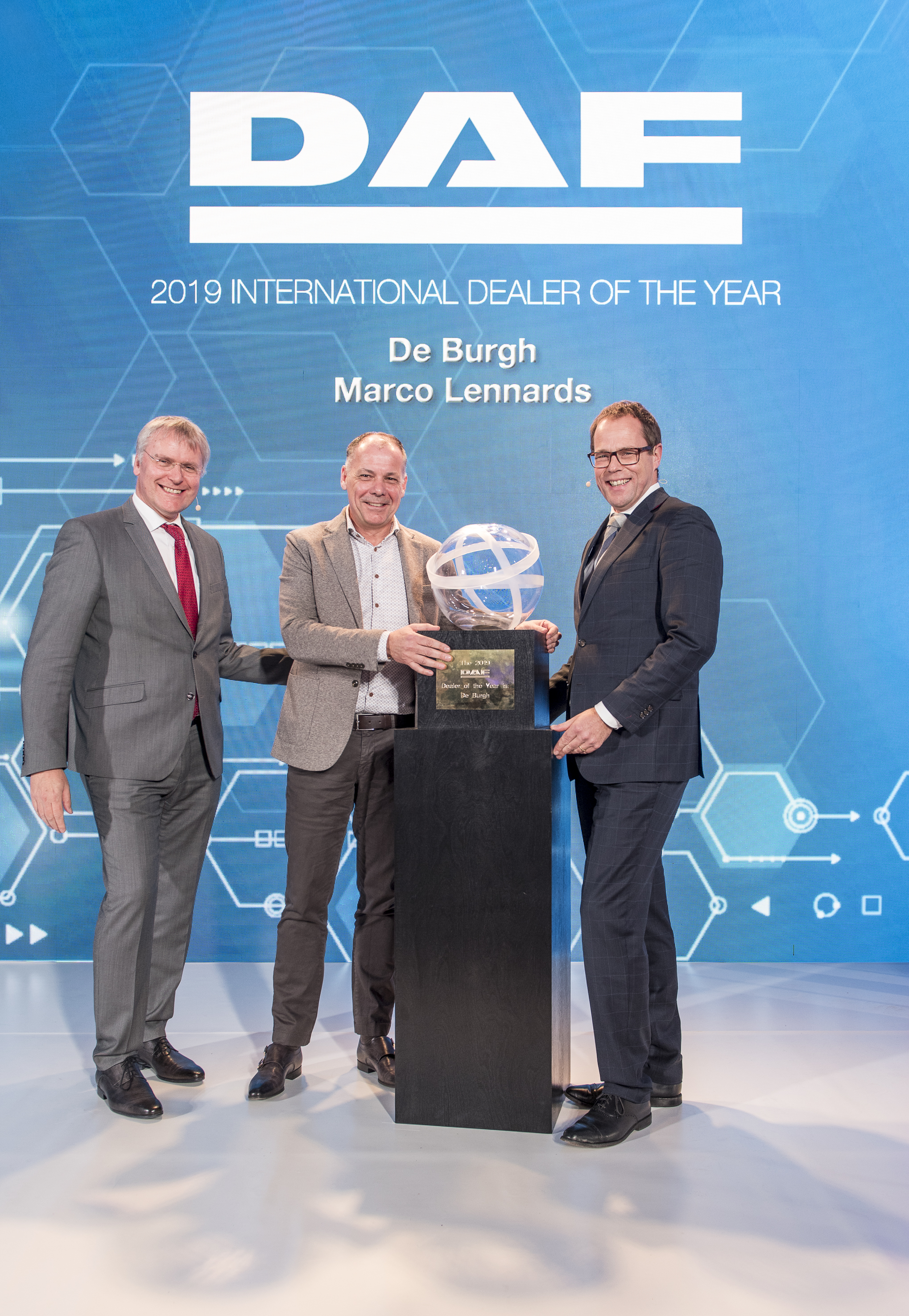 At its International Dealer Meeting in Malaga, Spain, DAF awarded De Burgh/LenGo from the Netherlands ‘2019 DAF International Dealer of the Year’ for its leading performance in terms of trucks, parts and financial services sales, as well as excellent customer satisfaction. Dealer F&G Commercials from the UK was named ‘PACCAR Parts Europe International Dealer of the Year’, whereas the Polish TB Truck & Trailer Serwis Sp. z o.o. dealership was awarded ‘PACCAR Financial Europe International Dealer of the Year’